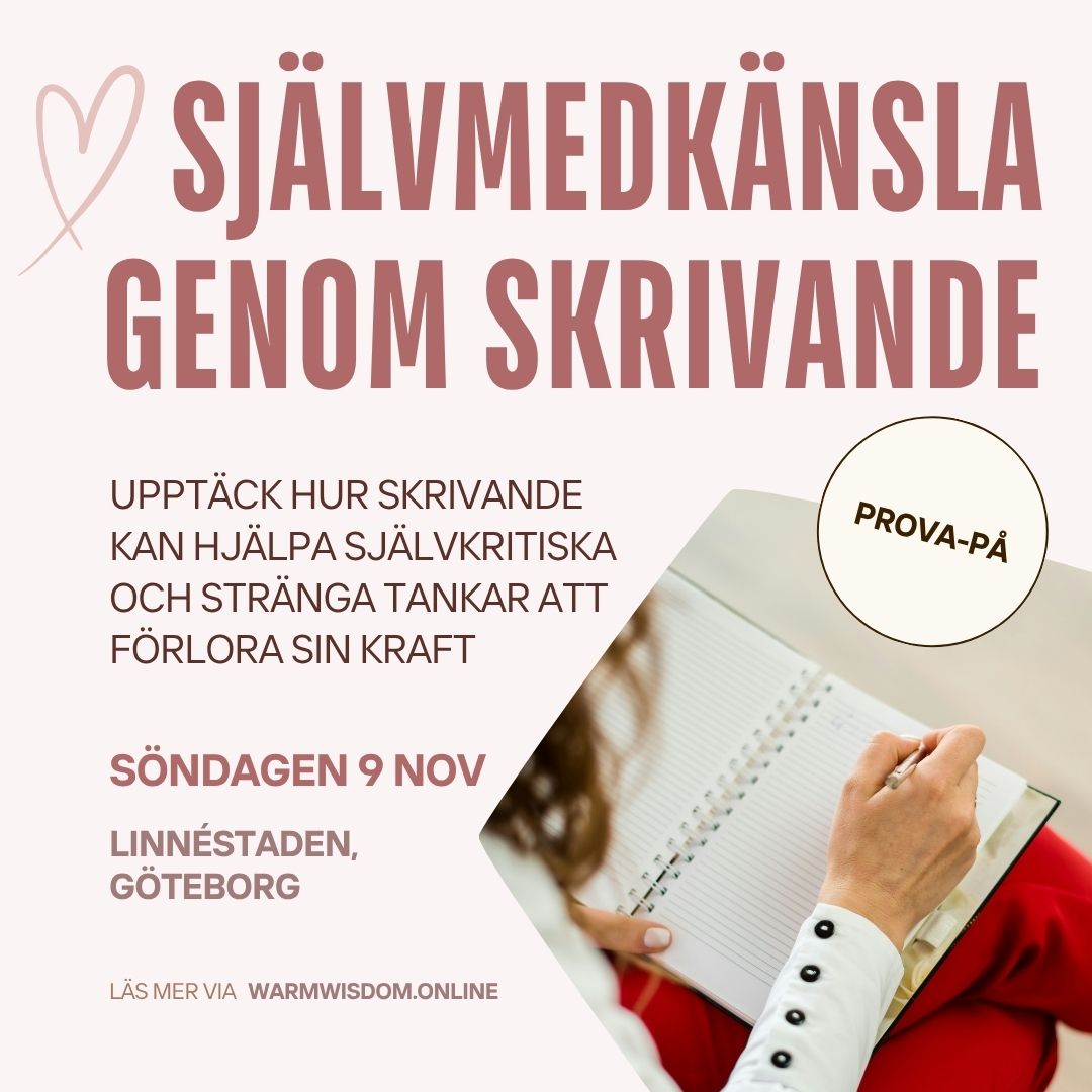Välkommen till en eftermiddag där du vägleds genom en avkopplande skrivövning som hjälper självkritiska och stränga tankar att förlora sin kraft. Du upptäcker hur skrivandet kan hjälpa dig tala till dig själv med större empati och tålamod. Vi öppnar upp ett lugnt och harmoniskt skrivrum där orden får flöda fritt utan självkritik eller bedömning. Fokus ligger på att lära genom processen snarare än på att skapa färdiga texter för andra att läsa 💗